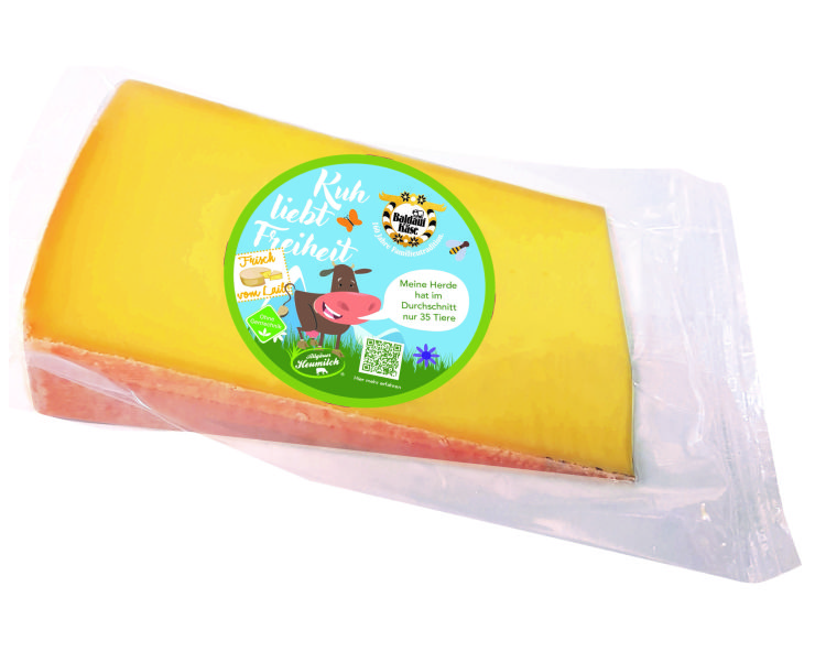 | Kuh liebt Freiheit | Mindestens 4 Mon.gereifter Schnittkäse aus dem Allgäu. Mild würzig im Geschmack geschmeidige Konsistenz. | Käsegruppe: Schnittkäse Land: Deutschland Milch: Kuhmilch Region: Allgäu