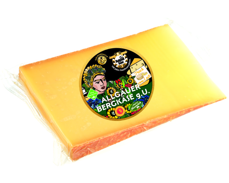 | Allgäuer Bergkäse g.U. | Mind.4 Monate gereifter Hartkäse aus dem Allgäu. Aromatisch, leicht nussig im Geschmack. Speckig-fester Teig. | Käsegruppe: Allgäuer Bergkäse g.U./ Hartkäse mit Rohmilch hergestellt Land: Deutschland Milch: Kuhrohmilch Region: Allgäu