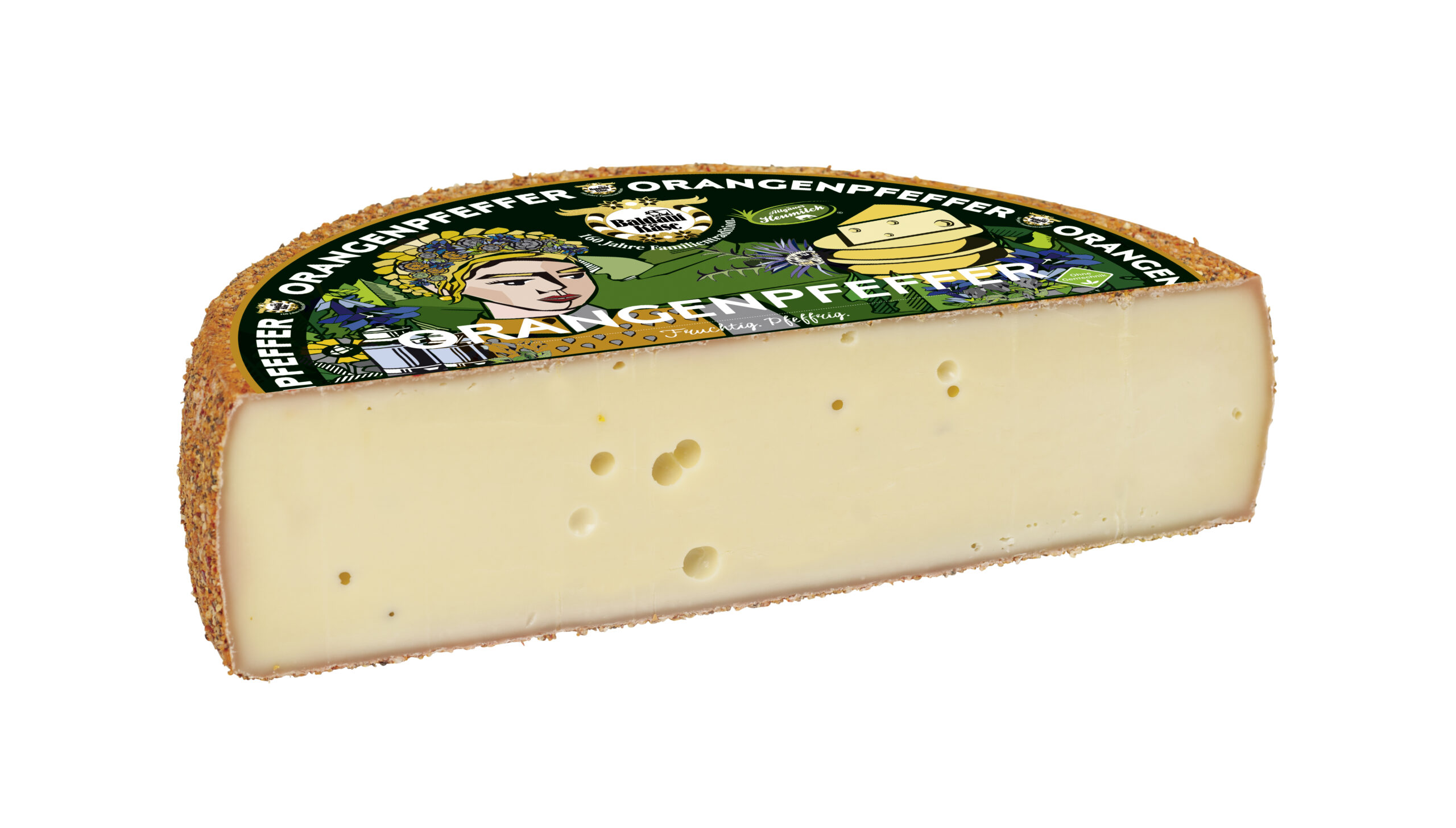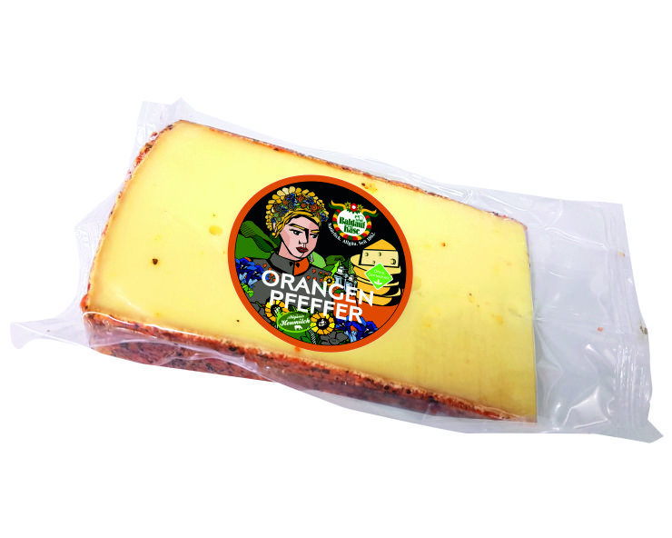 | Orangenpfefferkäse | Mind.2 Monate gereifter Schnittkäse mit Orangenpfeffermischung auf der Rinde. Aromatisch, leicht pfefferscharf. | Käsegruppe: Schnittkäse Land: Deutschland Milch: Kuhmilch Region: Allgäu