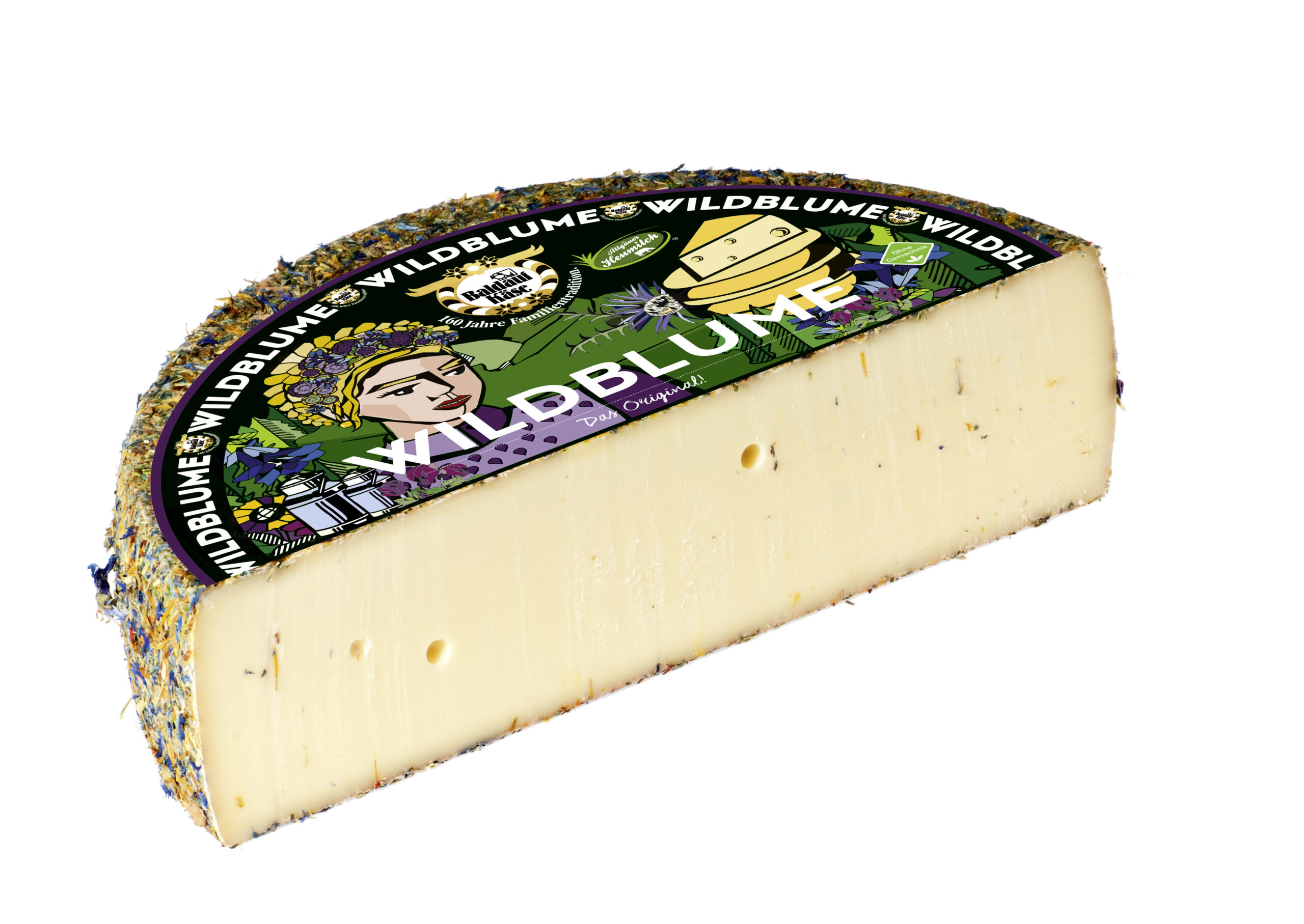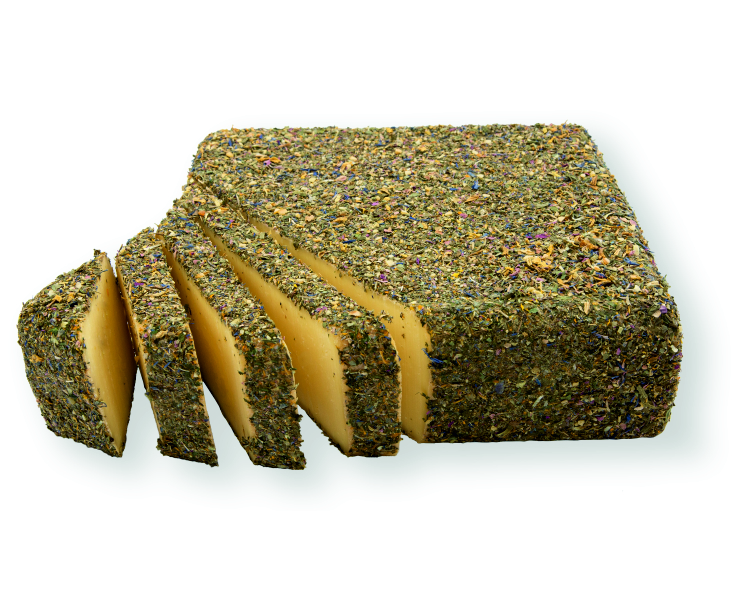 | Wildblumenkäse | Die Wildblumenrinde besteht u. a. aus Heublumen, Saflorblüten, Rosenblättern und Schabzigerklee. Der Käse reift 2 Mo. | Käsegruppe: Schnittkäse mit Kräuter- und Blütenmix Land: Deutschland Milch: Kuhmilch Region: Allgäu