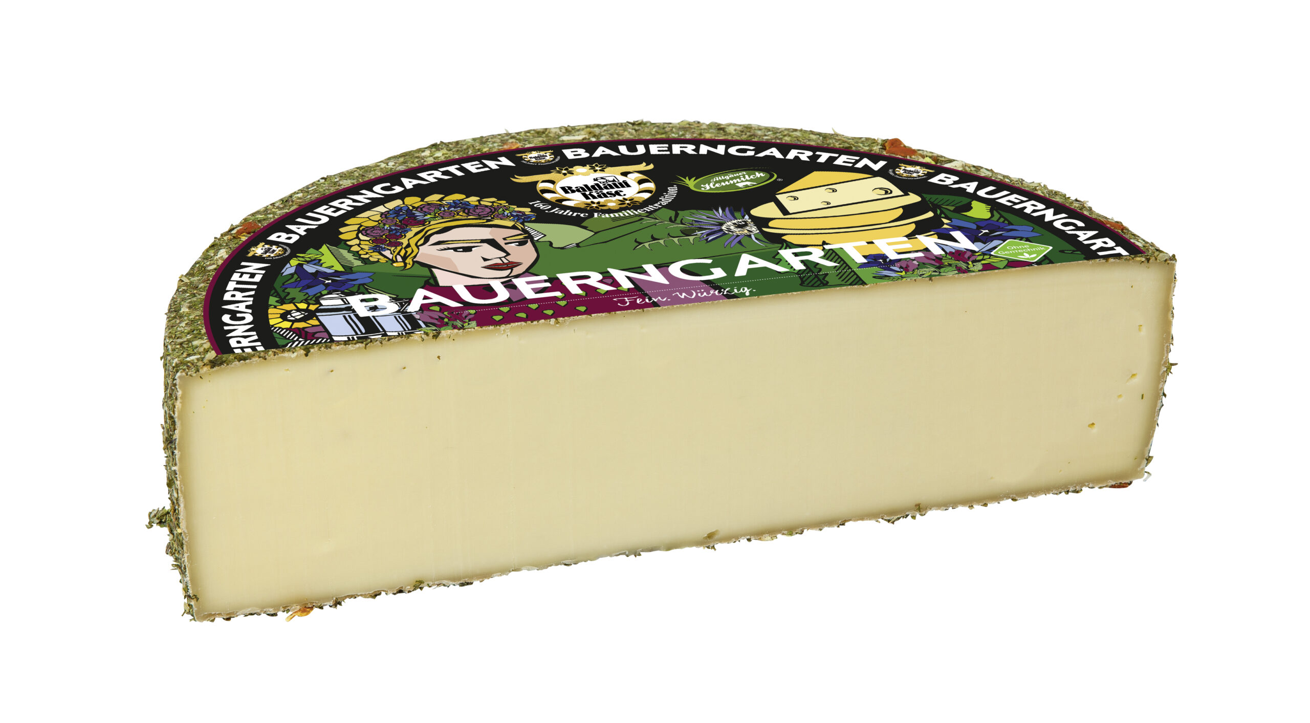 | Bauerngarten 1/2 Laib | Pikante Kräutermischung aus dem Bauern- garnten, umhüllt den 8 Wochen gereiften feinen cremigen Teig des Käses. | Käsegruppe: Schnittkäse Land: Deutschland Milch: Kuhmilch Region: Allgäu