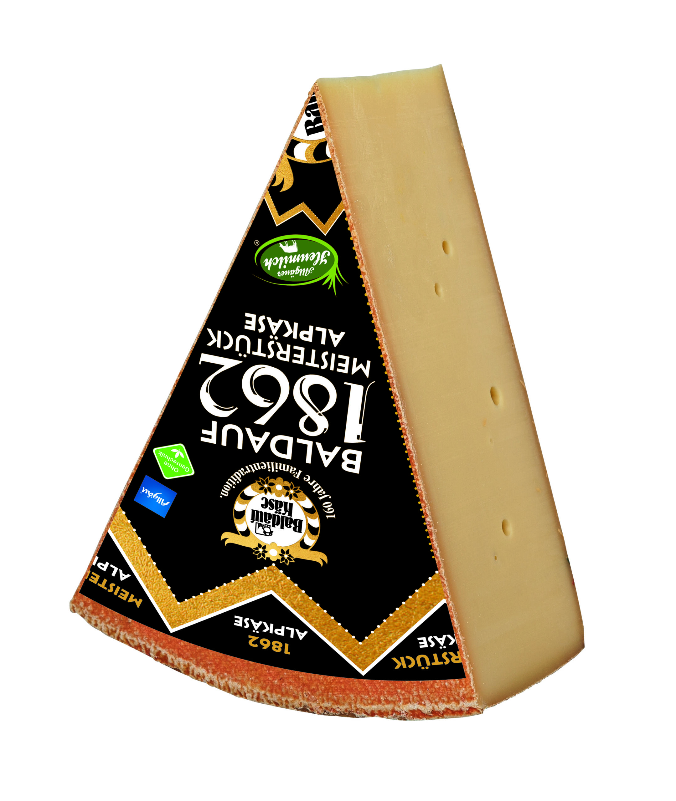 | Baldauf 1862 1/8 Laib | Bester Hartkäse mit einzelner kirschkern großen Lochung. Er hat einen kräftigen Geschmack, goldgelben Teig.8 Mo.gereift. | Geschmack: aromatisch Milch: Kuhrohmilch Region: Allgäu Käsegruppe: Hartkäse mit Rohmilch hergestellt Sonstiges: laktosefrei Land: Deutschland