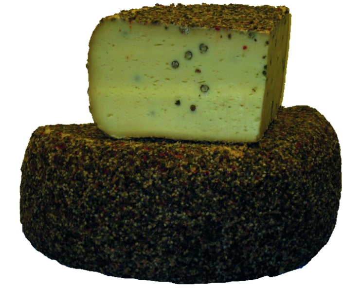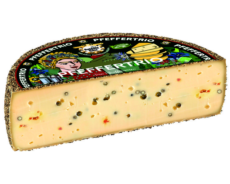 | Pfeffertrio 1/2 | Mind.2 Monate gereifter Schnittkäse aus dem Allgäu mit grünem, schwarzem & rosa Pfeffer verfeinert. Leicht scharf. | Käsegruppe: Schnittkäse Land: Deutschland Milch: Kuhmilch Region: Allgäu