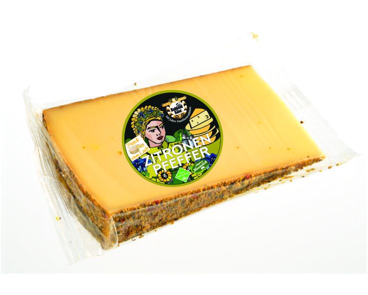 | Zitronenpfefferkäse | Die Kombination von einer frischen Note der Zitrone mit der edlen Schärfe des Pfeffers vereint. Mind.2 Monate gereift. | Käsegruppe: Schnittkäse Land: Deutschland Milch: Kuhmilch Region: Allgäu