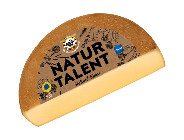 | Naturtalent 1/2 Laib | Mind. 4 Monate gereifter Hartkäse aus Rohmilch hergestellt. Nussiger Geschmack mit schnittfestem Teig. Rot geschmiert. | Käsegruppe: Hartkäse mit Rohmilch hergestellt Land: Deutschland Milch: Kuhrohmilch Region: Allgäu