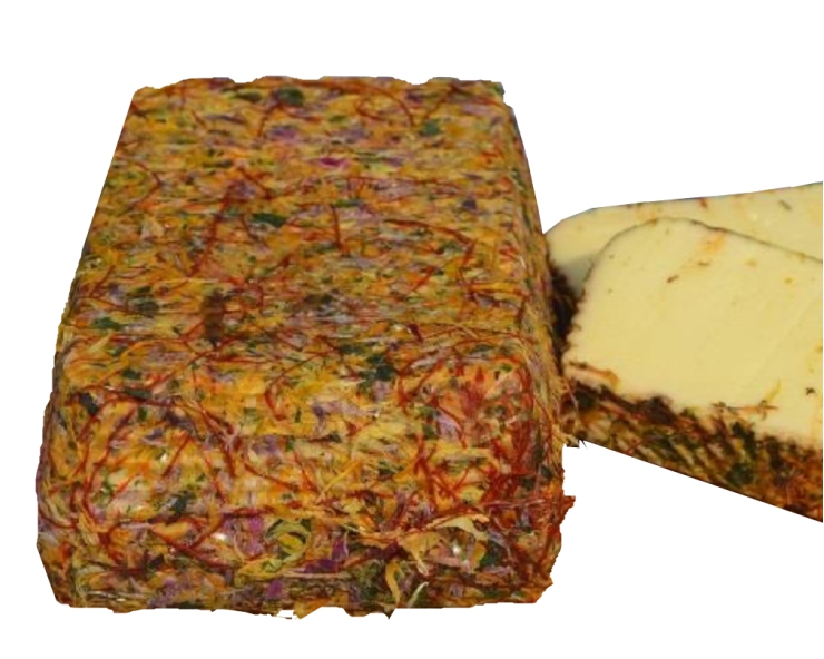 | Wildblumenkäse 1/2 Laib | Wildblumenrinde u.a. aus Heublumen, Saf- lorblüten u. Rosenblättern. Ein echter Hingucker u.Geschmacksexplosion i.Gaumen | Käsegruppe: Schnittkäse mit Kräuter- und Blütenmix Land: Deutschland Milch: Kuhmilch Region: Allgäu