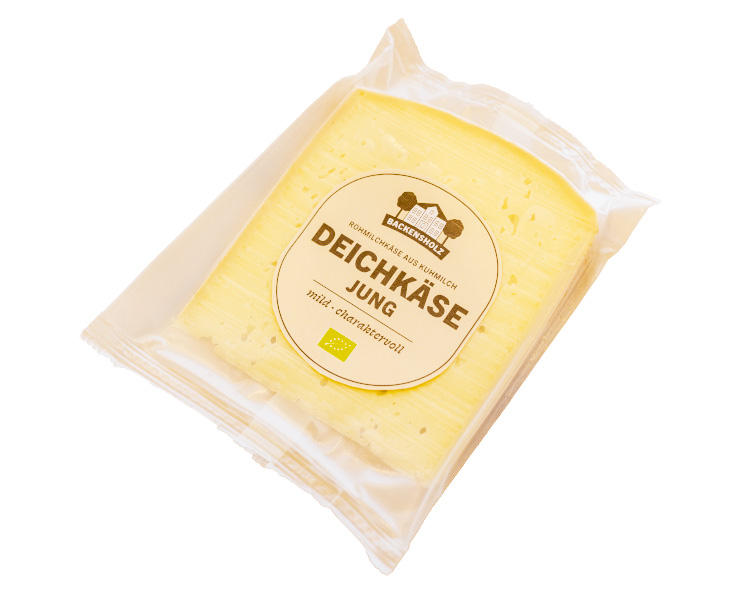 | Bio Deichkäse jung | Nach hauseigenen Rezepten auf dem Hof hinter dem Deich hergestellt. Cremig, mild, leicht nussig. Mind. 3 Mo.gereift | Käsegruppe: Bio Schnittkäse mit Rohmilch hergestellt Land: Deutschland Milch: Kuhrohmilch Region: Schlesw.-Holst.