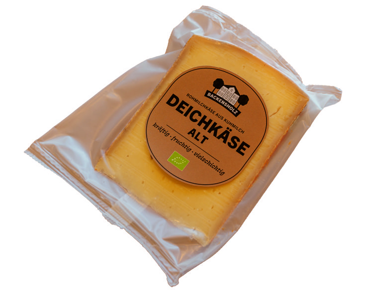 | Bio Deichkäse alt | Nach hauseigenen Rezepten auf dem Hof hinter dem Deich hergestellt. Cremig, sehr intensiv. Mind. 10 Monate gereift. | Käsegruppe: Bio Hartkäse mit Rohmilch hergestellt Land: Deutschland Milch: Kuhrohmilch Region: Schlesw.-Holst.