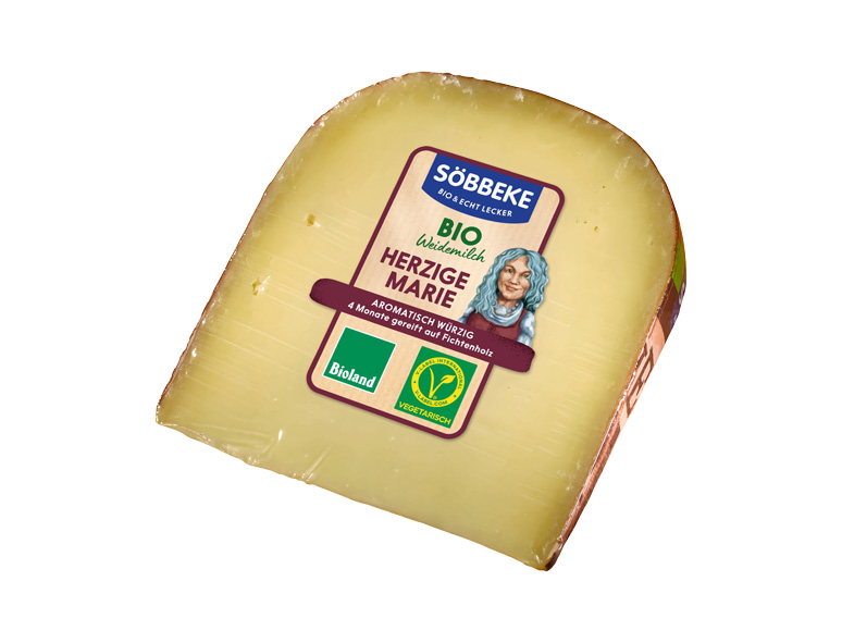 | Bio Herzige Marie | Mind. 4 Monate auf Fichtenholzbrettern gereifter Hartkäse in Bio-Qualität. Aromatisch-würzig im Geschmack. | Käsegruppe: Bio Hartkäse Land: Deutschland Milch: Kuhmilch Region: Münsterland