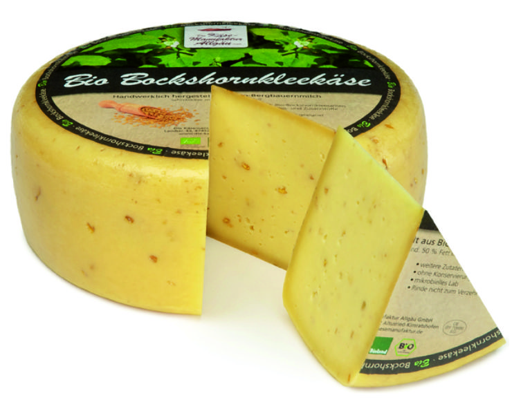 | Bio Bockshornkleekäse | Mind.6 Wochen gereifter Schnittkäse mit Bockshornkleesamen verfeinert. Leicht nussiger, zart würziger Geschmack. | Käsegruppe: Schnittkäse Land: Deutschland Milch: Kuhmilch Region: Allgäu