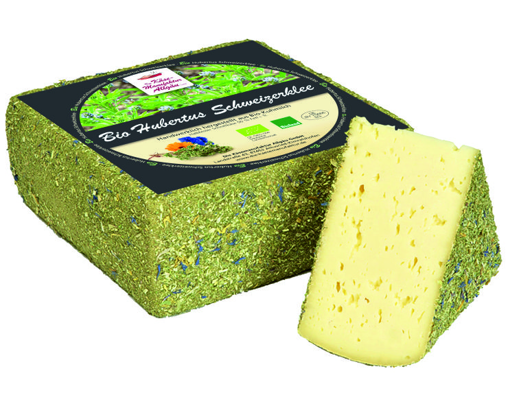 | Bio Hubertus Schweiz.klee | Mind.6 Wochen gereifter halbfester Schnittkäse mit Schabzigerklee ummantelt Cremiger Teig. Würzig, leicht nussig. | Käsegruppe: Halbfester Schnittkäse mit Rotkultur und Schabzigerklee Land: Deutschland Milch: Kuhmilch Region: Allgäu