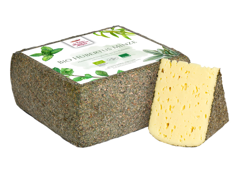 | Bio Hubertus Minze | Mind.6 Wochen gereifter halbfester Schnittkäse mit Minze & Kräutern umman- telt. Würzig, mit feiner Minz/Zitrusnote | Käsegruppe: Halbfester Schnittkäse mit Rotkultur, Minze und Kräutern Land: Deutschland Milch: Kuhmilch Region: Allgäu