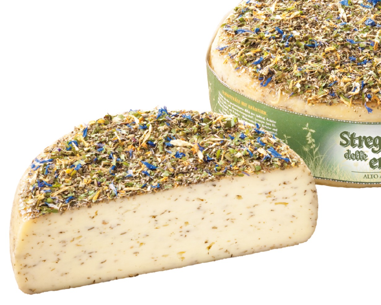 | Kräuterhexe | Der Käse wird mit Kräutern verfeinert, die Rinde mit Kräutern und Blumen aus Südtirol dekoriert, geschmeidiger Teig. | Käsegruppe: Schnittkäse mit Kräutern Land: Italien Milch: Kuhmilch Region: Südtirol
