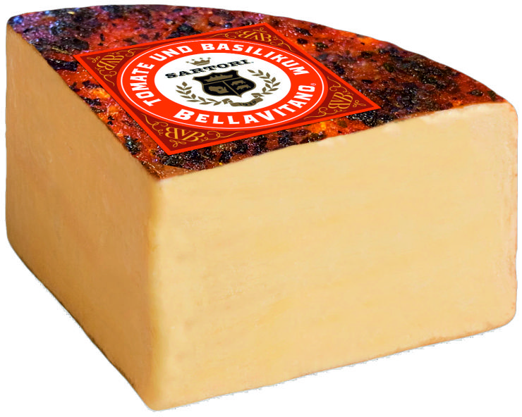 | BellaVitano Tomate & Bas. | Amerikanischer Einfallsreichtum - Handge machte Produktion - In Höhlen gereift - Hand eingerieben-mit Tomate & Basilikum. | Käsegruppe: Hartkäsezubereitung mit einer Tomate-Basilikum Gewürz- Land: USA(Wisconsin) Milch: Kuhmilch Region: Wisconsin