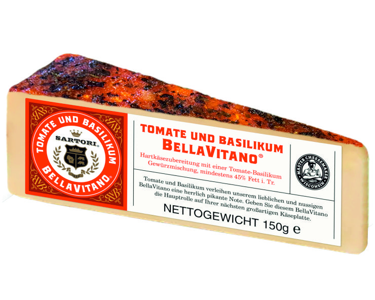 | BellaVitano Tomate & Bas. | Amerikanischer Einfallsreichtum - Handge machte Produktion - In Höhlen gereift - Hand eingerieben-mit Tomate & Basilikum. | Käsegruppe: Hartkäsezubereitzung mit einer Tomate-Basilikum Gewürz- Land: USA(Wisconsin) Milch: Kuhmilch Region: Wisconsin