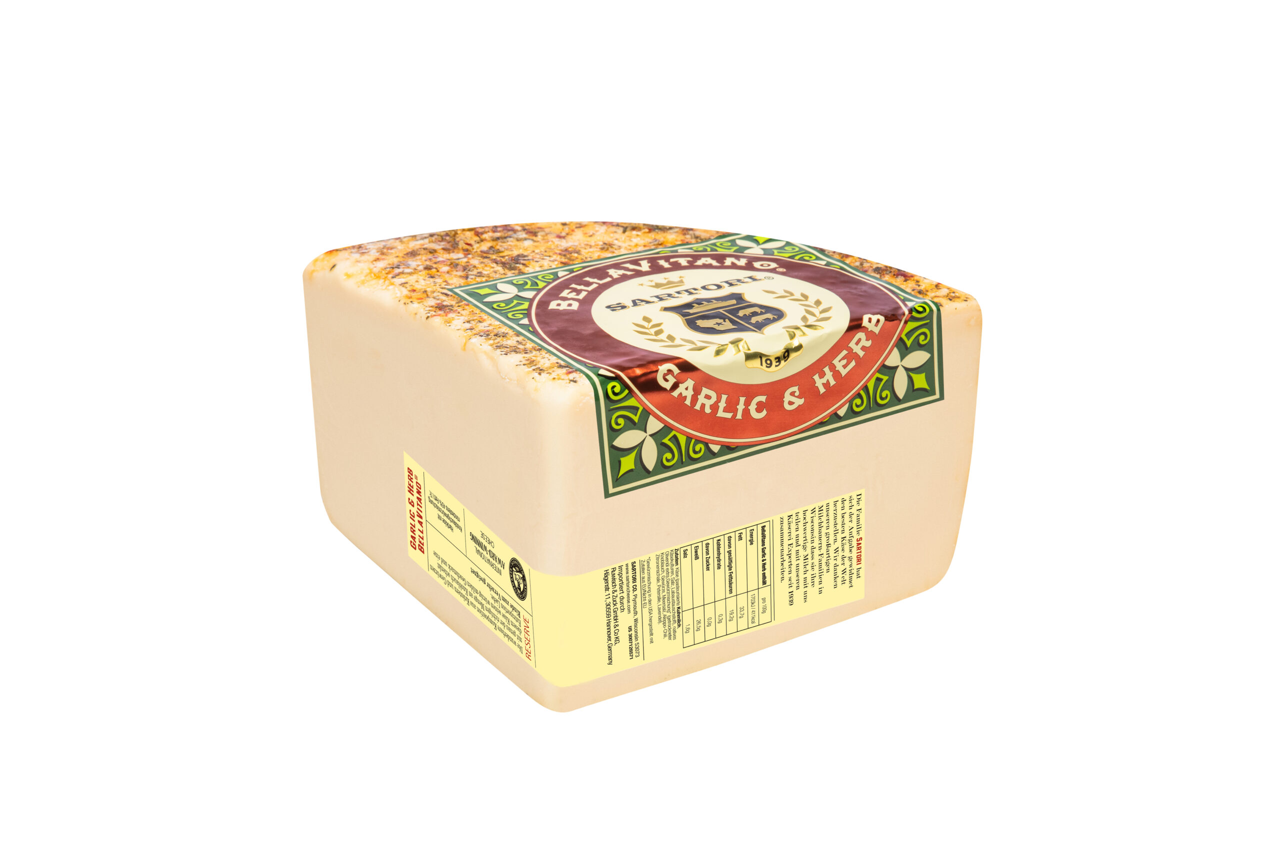 | BellaVitano Knobl.& Kräut | Amerikanischer Einfallsreichtum-handgem. Produktion-in Höhlen gereift- per Hand eingerieben-mit Knoblauch und Kräutern. | Käsegruppe: Hartkäse mit Knoblauchgewürzmischung Land: USA(Wisconsin) Milch: Kuhmilch Region: Wisconsin
