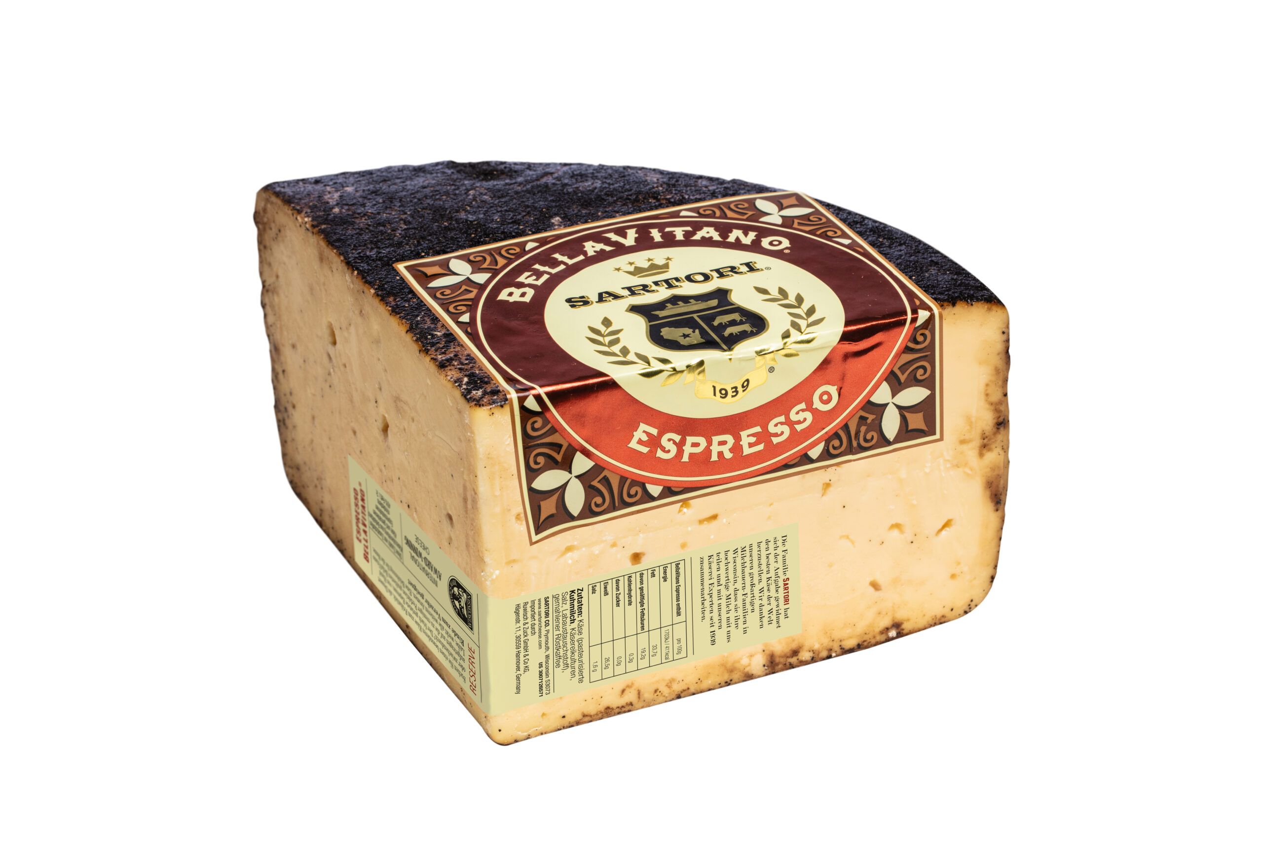 | BellaV. Espresso 1/4 Laib | Amerikanischer Einfallsreichtum - Handge machte Produktion - In Höhlen gereift - Per Hand eingerieben - hier mit Espresso | Geschmack: pikant Milch: Kuhmilch Region: Wisconsin Käsegruppe: Käsezubereitung aus BellaVitano Käse und gemahlenen Sonstiges: laktosefrei Land: USA(Wisconsin)